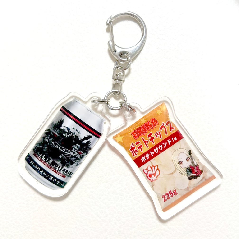 今回は「宅飲み」をテーマに、「ERIKA缶ビール」と「ERIKAポテトチップス」の2連アクリルキーホルダーです。